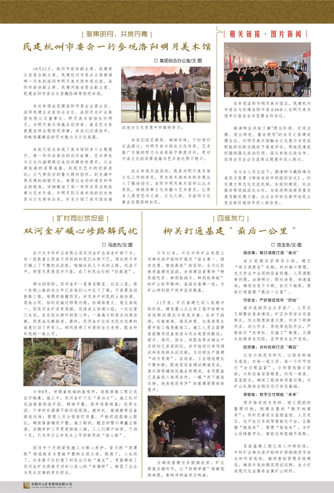 洛陽(yáng)開(kāi)元礦業(yè)集團(tuán)有限公司簡(jiǎn)介洛陽(yáng)開(kāi)元礦業(yè)集團(tuán)有限公司,始成立于2006年,位于洛陽(yáng)市開(kāi)元大道269號(hào)。集團(tuán)旗下共有十余家全資子公司,業(yè)務(wù)涉及有色金屬礦山開(kāi)發(fā)、礦產(chǎn)品購(gòu)銷(xiāo)與進(jìn)出口貿(mào)易、房地產(chǎn)開(kāi)發(fā)、文化藝術(shù)、企業(yè)管理與咨詢、資本投資等多個(gè)領(lǐng)域。民建河南省委委員、民建河南省委企業(yè)委副主任、民建洛陽(yáng)市委委員、企業(yè)委主任、洛陽(yáng)民建企業(yè)家協(xié)會(huì)會(huì)長(zhǎng)許明月是公司創(chuàng)始人,現(xiàn)任洛陽(yáng)開(kāi)元礦業(yè)集團(tuán)有限公司董事長(zhǎng)。在礦業(yè)領(lǐng)域,自營(yíng)項(xiàng)目有三個(gè)在產(chǎn)礦山,日處理達(dá)5000噸規(guī)模,主要產(chǎn)品為金精礦粉,銅精礦粉,鋅精礦粉,鐵粉等。擁有多家實(shí)力雄厚的子公司:貴州開(kāi)元礦業(yè)有限公司探、采礦權(quán)面積共11.33平方公里;興??h銅鑫礦業(yè)有限公司探礦權(quán)面積8.76平方公里,礦山資源潛力巨大;2021年,開(kāi)元集團(tuán)與盧氏中科礦業(yè)有限公司開(kāi)展戰(zhàn)略合作。目前,盧氏中科王家河選礦廠擴(kuò)改升級(jí)圓滿落地;雙河金礦地質(zhì)勘探捷報(bào)頻傳,為資源儲(chǔ)備注入強(qiáng)心劑;后瑤峪西溝鐵礦創(chuàng)新探礦模式,發(fā)掘多處新礦體;2025年,集團(tuán)成功取得新疆青河縣敖包西銅多金屬礦和精河縣托遜能蘇銅多金屬礦兩大礦權(quán),2026年,集團(tuán)成功收購(gòu)、接管林西天成礦業(yè)有限公司,進(jìn)一步拓展資源版圖。在文化傳媒領(lǐng)域,洛陽(yáng)市明月美術(shù)館通過(guò)豐富多樣的藝術(shù)展覽、學(xué)術(shù)研討和公共教育活動(dòng),努力打造一個(gè)集展覽、交流、教育、研究為一體的綜合性藝術(shù)平臺(tái)。此外,在金融投資領(lǐng)域,開(kāi)元集團(tuán)旗下的北京明峰資本管理有限公司專注于投資具有高增長(zhǎng)潛力的優(yōu)秀企業(yè),特別是高科技、新能源、環(huán)保等新興產(chǎn)業(yè),為客戶提供個(gè)性化的資產(chǎn)配置服務(wù)。在做好企業(yè)經(jīng)營(yíng)的同時(shí),開(kāi)元集團(tuán)始終不忘企業(yè)的社會(huì)責(zé)任和家國(guó)情懷,以突出的愛(ài)心公益事跡,開(kāi)展了一系列公益慈善活動(dòng):“民建林”公益事業(yè)通過(guò)“思源基金”“幫幫公益”線上公益平臺(tái),與眾多愛(ài)心人士籌措資金20余萬(wàn)元;資助541名貧困大學(xué)生共計(jì)270余萬(wàn)元,推進(jìn)“數(shù)字助力一一河南AI人才培養(yǎng)”;捐款10萬(wàn)元,馳援京津冀、黑龍江洪水地質(zhì)災(zāi)害……公司于2017年底被洛陽(yáng)市慈善總會(huì)評(píng)為“洛陽(yáng)慈善風(fēng)云榜--十大愛(ài)心集體”。從捐資助力洛寧縣宅延村基礎(chǔ)設(shè)施升級(jí)、暖心修繕西茄子河村出行道路;到聞“汛”而動(dòng),緊急捐贈(zèng)專業(yè)防汛物資馳援嵩縣白河鎮(zhèn);再到赴河北豐寧縣開(kāi)展“同心助振興”幫扶活動(dòng),捐贈(zèng)生活物資為鄉(xiāng)村文明建設(shè)添磚加瓦;更持續(xù)深耕“黃河濕地保護(hù)公益林”建設(shè),以多年堅(jiān)守為母親河筑起綠色屏障。每一次愛(ài)心捐贈(zèng),每一項(xiàng)公益行動(dòng),都踐行著開(kāi)元“發(fā)展不忘回饋社會(huì)”的初心,讓溫暖在更多角落傳遞。洛陽(yáng)開(kāi)元礦業(yè)集團(tuán)有限公司秉承持續(xù)發(fā)展理念,憑借多年來(lái)良好的企業(yè)信譽(yù)與經(jīng)營(yíng)業(yè)績(jī),與全國(guó)多家企業(yè)建立了良好合作關(guān)系,受到社會(huì)各界的一致好評(píng),多次榮獲“納稅標(biāo)兵”“先進(jìn)企業(yè)”“招商引資模范企業(yè)”等榮譽(yù)稱號(hào)?;赝麃?lái)時(shí)路,開(kāi)元人勠力同心,以"闖"的精神和"創(chuàng)"的勁頭,一路披荊斬棘,踏過(guò)千山萬(wàn)水;展望新未來(lái),開(kāi)元人凝心聚力,不執(zhí)于"舊",無(wú)畏于"新",秉承"勇于跨越,追求卓越"的企業(yè)精神,乘著國(guó)家高質(zhì)量發(fā)展新征程的東風(fēng),跨過(guò)高山,越過(guò)大海,向著集團(tuán)多元化、國(guó)際化的目標(biāo),逐夢(mèng)遠(yuǎn)航,跨越前行!